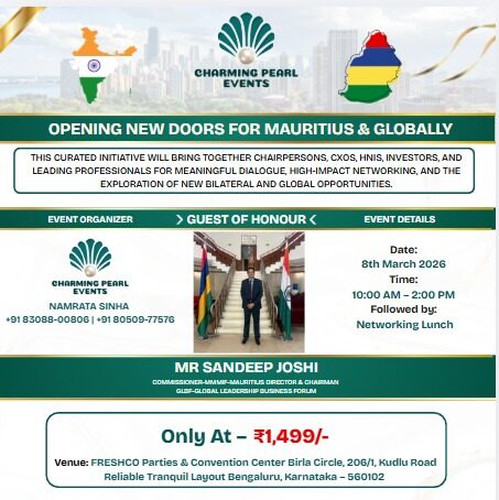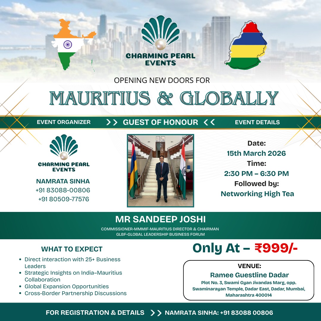 Join an exclusive business networking and opportunity event presented by Charming Pearl Events. This special gathering brings together entrepreneurs, business leaders, and growth-focused professionals for an insightful evening centered around India–Mauritius collaboration, global business opportunities, and meaningful networking. The event will feature Mr. Sandeep Joshi, Commissioner – MMMIF Mauritius, Director & Chairman of GLBF – Global Leadership Business Forum, as the Guest of Honour.