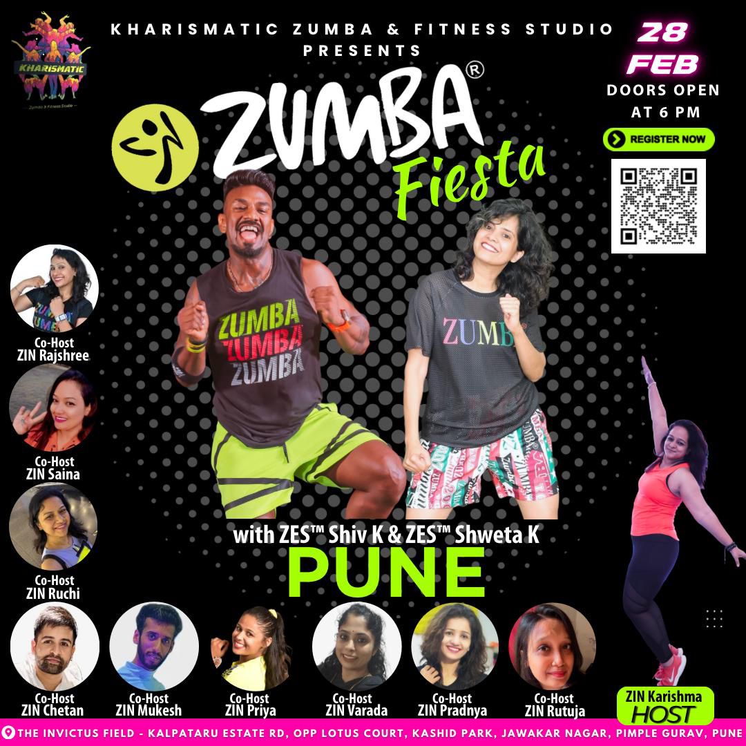 Get ready, Pune! An electrifying evening of rhythm, energy, and non-stop fitness awaits you at the grand ZUMBA® Fiesta, proudly presented by Kharismatic Zumba & Fitness Studio. This event is co-sponsored by Charming Pearl Events, collaborating with Kharismatic Studio to bring you a high-energy fitness celebration.